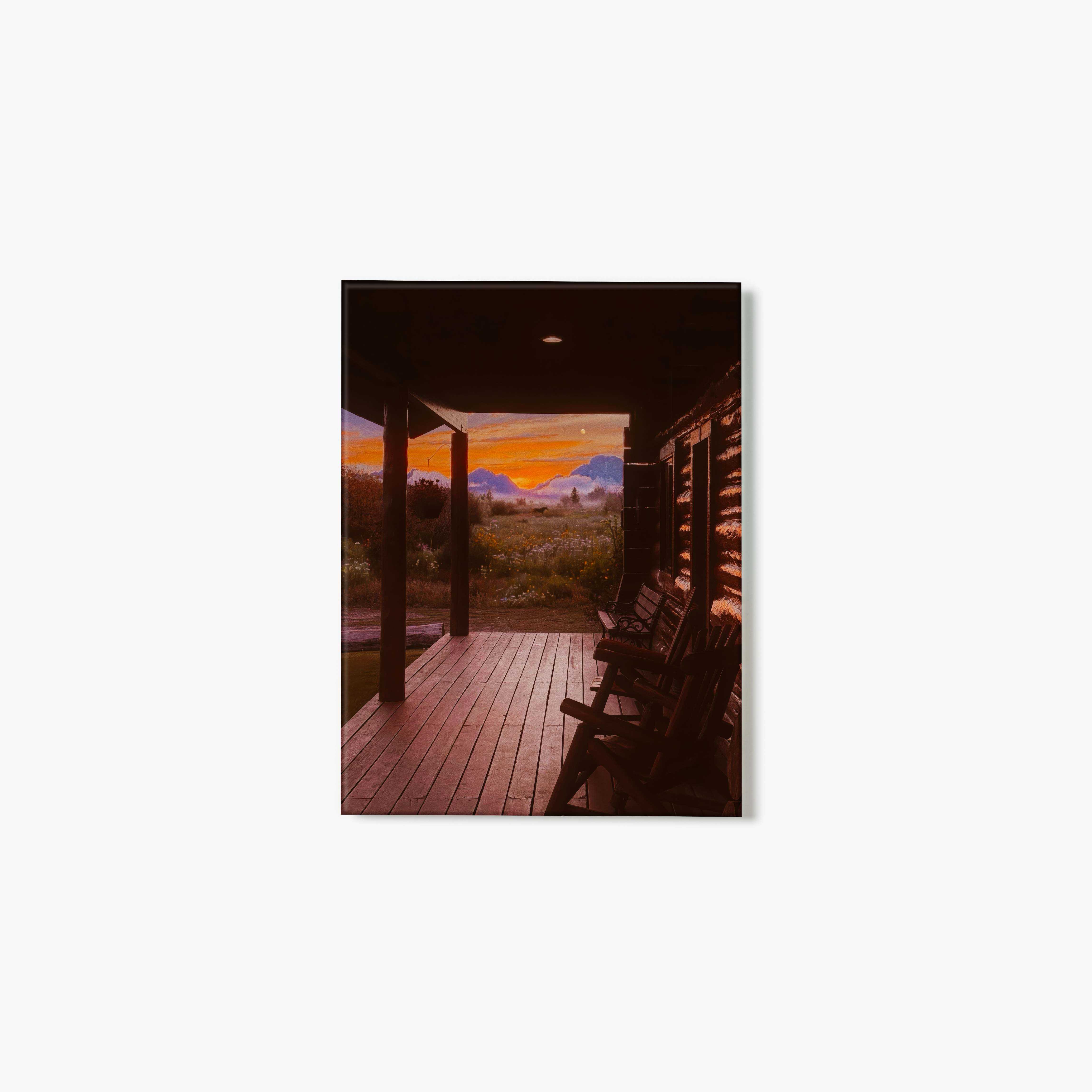 This front porch was dropped into a dream. Siobhan O'Dwyer layers in wildflower fields, purple mountains, and the moon against an orange sky—giving this Jackson Hole ranch an unforgettable view.